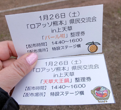 あまりの寒さに予定時刻より早くスタッフの方が配ってくれた本日の「振るまい」は、天草大王鍋とパール柑。どちらも天草特産♪