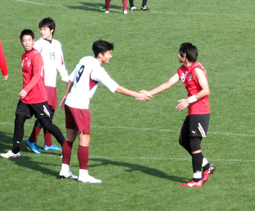 袖まくりして戦うキタジくんがファールでプレー止まってごめんね♪というトックンと握手。