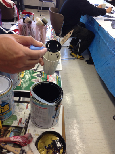 それはそうと、ペンキの移し替えに秘密兵器登場。湯豆腐すくうだけがお玉の仕事じゃございません。