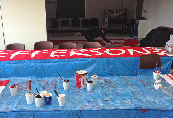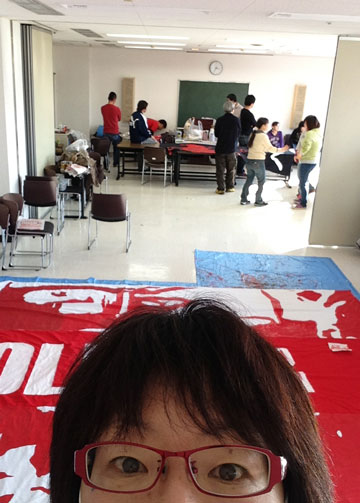 みんながお昼を食べに出てる間も黙々と大型幕と赤ペンキとの格闘を続ける赤馬戦士がひとり。