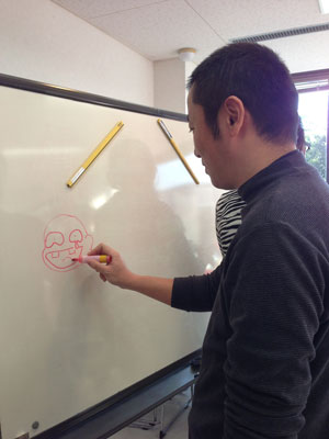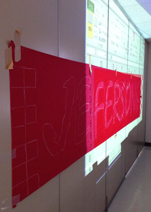 まず幕のデザインをプロジェクターで壁に貼った幕布に投影して画像を人力で写し取ります。