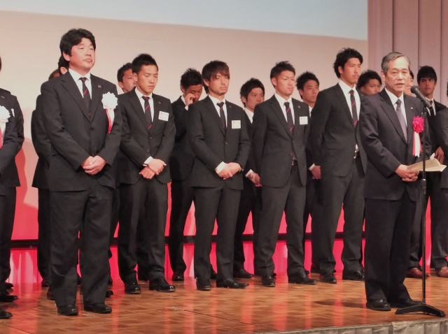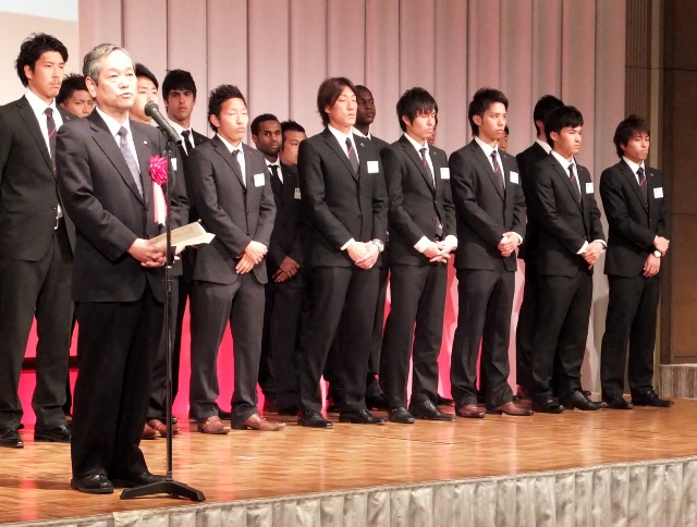 その後ひとりひとり選手スタッフが壇上に並び、最後に監督登場。スポンサー様への監督挨拶も新任のときと何ら変わることなく芯はブレないヨシダ監督が本当に頼もしいのです。