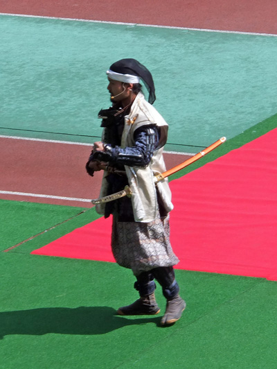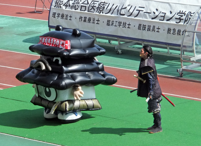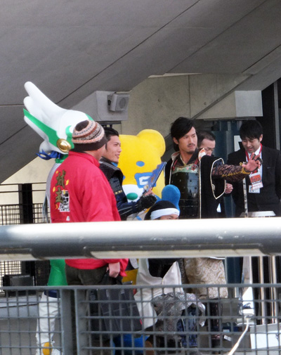 太鼓聞きながらゲート内を見たら、鳥取のマスコットガイナマンと熊本城おもてなし武将隊の殿方が記念撮影中。シュールな図。