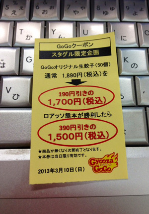 美味しすぎて写真撮る前にみんなで食べちゃったGoGo餃子さんのクーポン。次こそロアッソが勝利したら絶対買って帰ります♪
