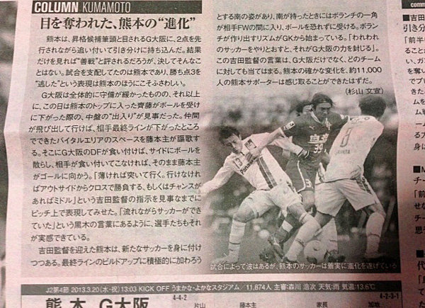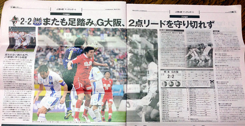 切り口は「また勝てなかったガンバ」。しかも熊本に。それで「J1復帰に暗雲」てのは時期尚早とともに熊本を取るに足りないチームと断じているに等しい。