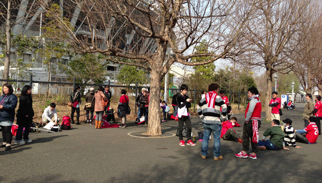 アウェーサポの待機場所へと何事も無く到着。うちの待機列のほのぼの感はたぶんJリーグで一番。どこへ行っても担当スタッフさんのお仕事がラクなアウェーサポーターだと自負していいレベルじゃないかなあ。