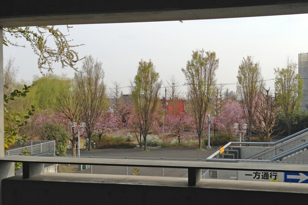 お手洗いに向かう階段の踊り場から見た待機場所の桜並木。この季節に来ることができてよかった。