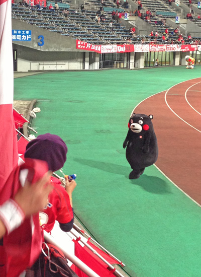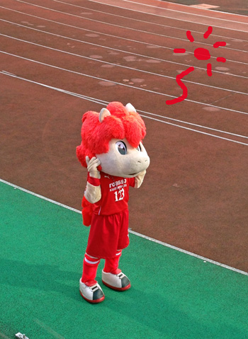 子馬がHTのお仕事からアウェー側へ遊びに行くのが定番になっているため、もはや熊本のホームゴール裏担当マスコットとなっております。菊池の古代人とチャンバラもほぼ定番。