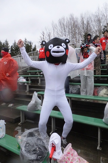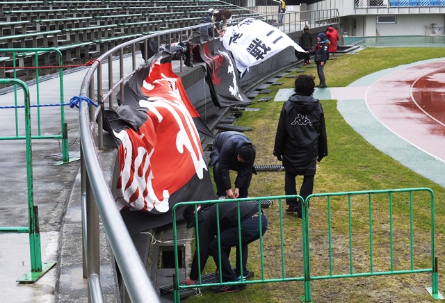 熊本側も、相手より先に弾幕との戦い。細い女子サポさんは本当に飛ばされるんじゃないかとマジで心配しました。