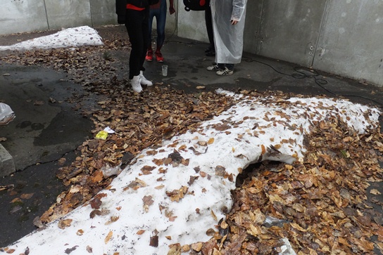 スタンドへ上がる階段下で風をよけながらの食事でした。この白い物体は「雪」です。雨でも風でもまったく溶けてません。