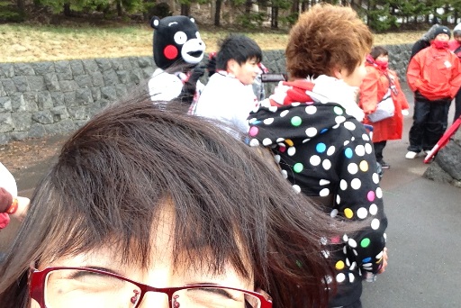 脱帽の瞬間こんな状態です。コールリーダーの力強いヘアスタイルも強風でモフモフです。