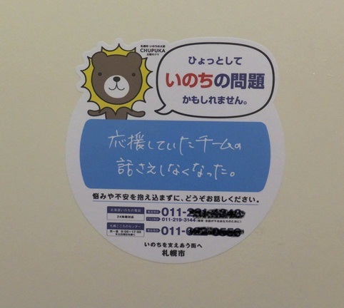 厚別のお手洗いにあったいのちの電話広告。わかりやすくて胸に迫るものがあります。