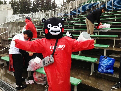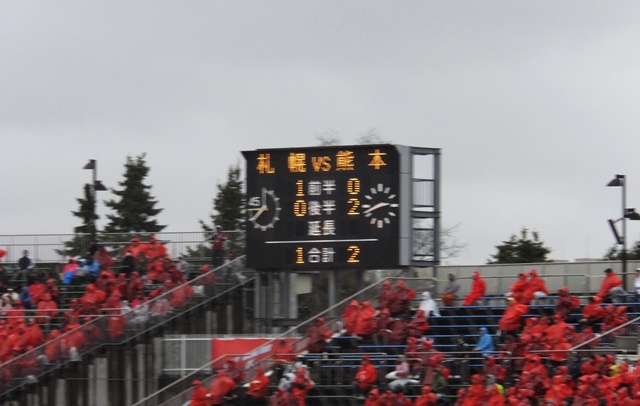 朝から吹き曝しのアウェースタンドで雨風を真っ正面から受け続けた熊本サポは、試合中ほとんど口が回らず選手コールもチャントもまともに歌えなかったのに、