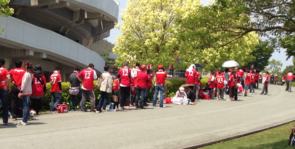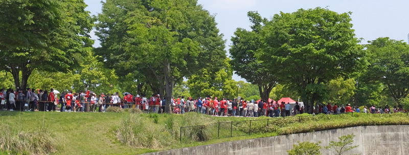 一般入場待機列が緑の中で一直線に伸びて綺麗です。緑には赤だねえ。