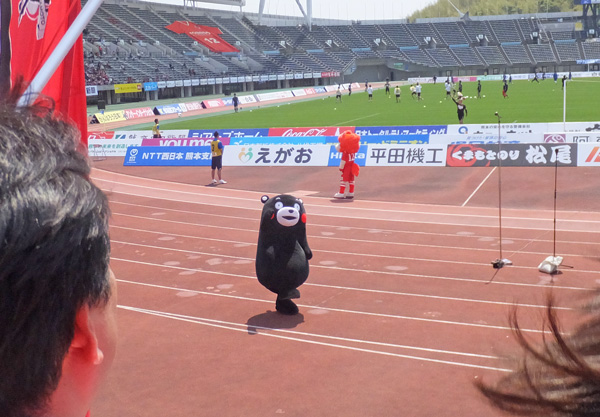 ゴール裏のチャントに合わせてステップ踏むくまモン。もうすっかり子馬に取って代われるだけの応援スキルが身についているとみました。後ろ向きの彼〜ボヤボヤしてられないよう(^_^;)