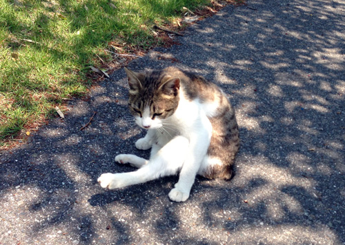 お天気いいのでうまスタにゃんこがひなたぼっこしながら毛繕い中。声をかけたらチラ見されました。