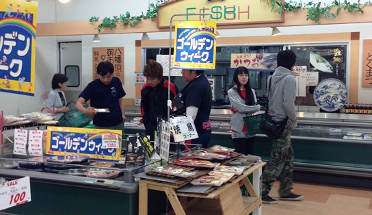 帰りは、昨年の愛媛遠征と同様八幡浜港からフェリーです。その前に晩ご飯をショッピング。祝勝だってんでほとんどのメンバーさんがお寿司コーナーでお買い上げ。