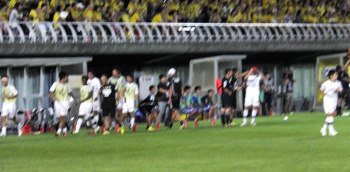 跳ね返しては向こう側に持って行かれるボールとアウェーユニの赤馬衆の後ろ姿を