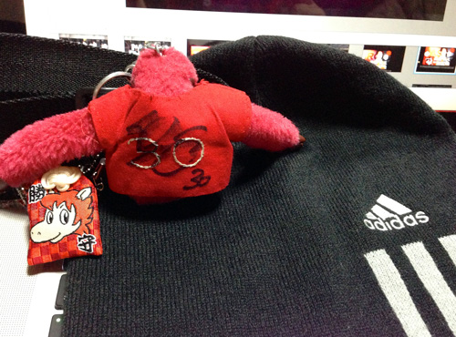 30番くん入団直後に購入したリュックに付いていたマスコットのお猿くんが何となく似ていたので、端布で即席に作った30ユニを着せて持ち歩くこと3シーズン。