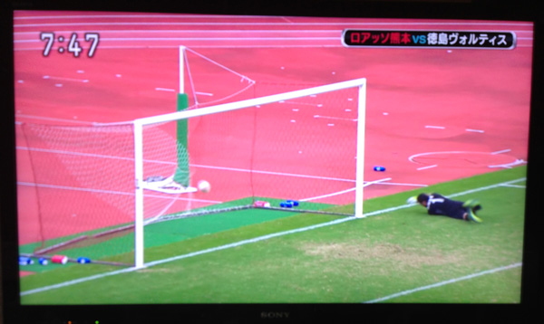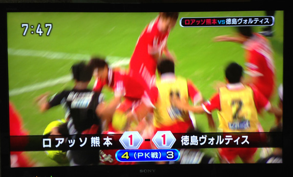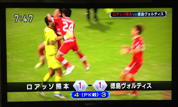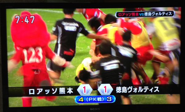 徳島の5人目のシュートは横っ飛びのハタくんの左手がゴールから弾き出して、その瞬間ロアッソ熊本の勝利が決まりました!!!