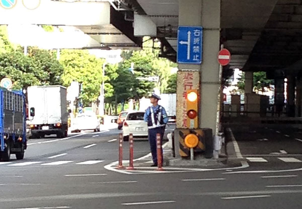 ホテルから空港へ向かう天王洲アイルの駅前交差点。信号の切り替えを素早く伝えるためにお巡りさんが交通整理していました。