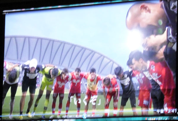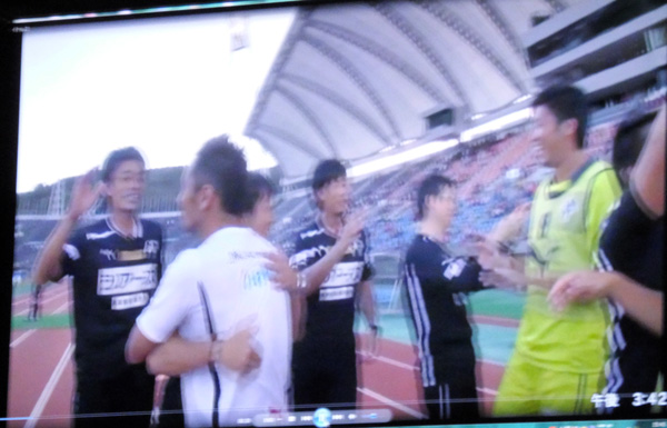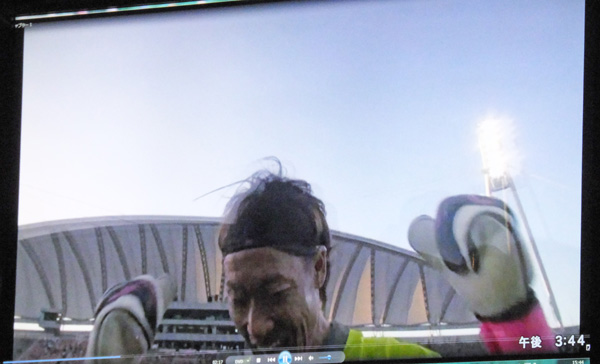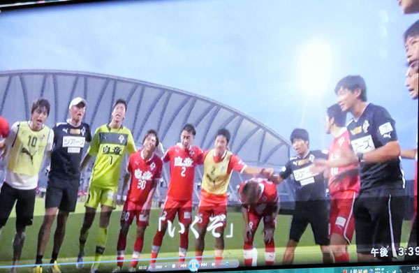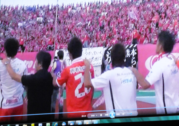 選手登場の前に流れた映像は、天皇杯2回戦の徳島戦と前節の東京V戦のチームの様子をACスタッフさんが撮影した密着ドキュメント。そのまま動画を置くわけにはいかないのでショットをいくつか。ブレブレなのはパソコン動画をデジカメで撮ったせいだと思います。技術的なことは知らんけど。