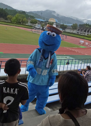 讃岐サポーターの彼の頭には讃岐うどんのどんぶり! なんとも可愛くて子供たちに大人気♪