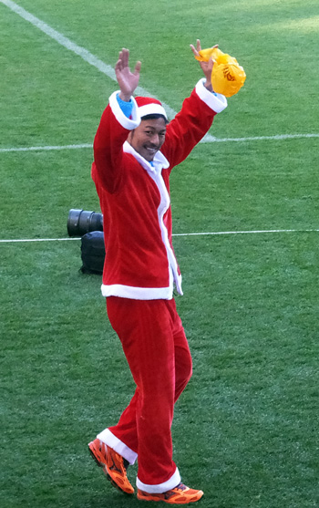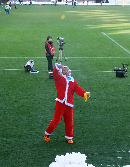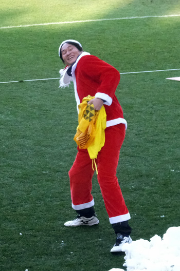 サインボールを投げる選手はなぜかサンタスタイル。もういくつ寝るとお正月という28日だったけど気にしないっ。