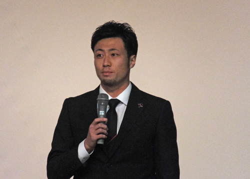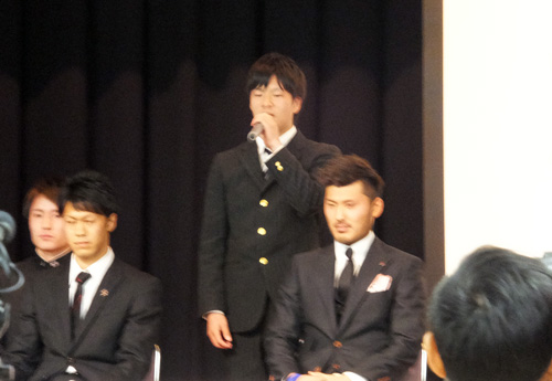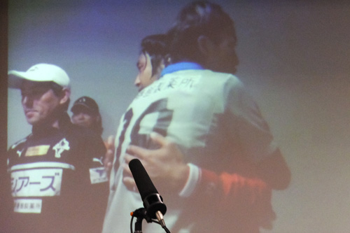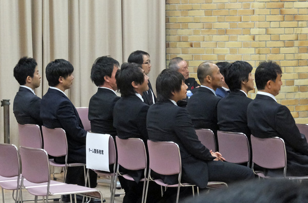 その後選手だけがステージに残り、スタッフは着席してくださいとのアナウンスにより、ステージ下に移動した監督以下スタッフ陣。その中にキタジくんがいる不思議。