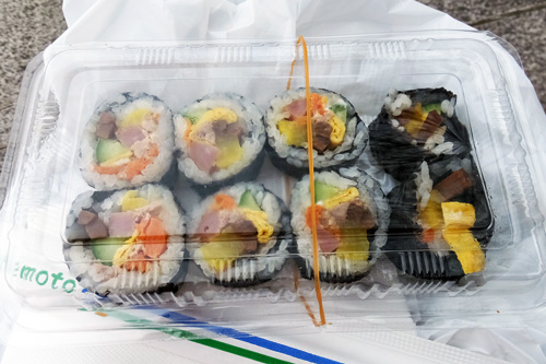 小ぶりな巻き寿司に見えるけど、ご飯は酢飯じゃなく巻海苔にはゴマ油が塗ってあるのでコクがあるのにさっぱりと美味しいです。これはリピートしちゃうよ。
