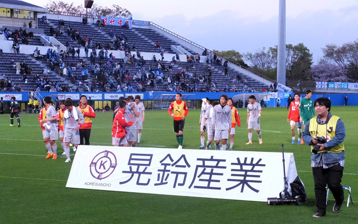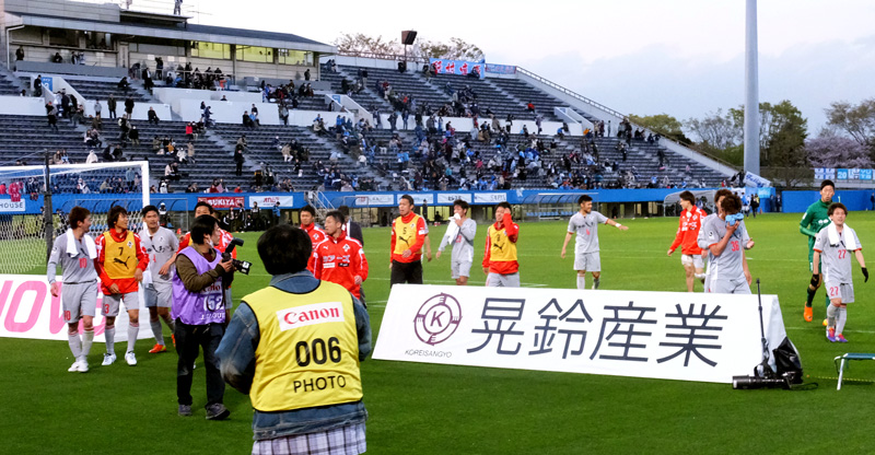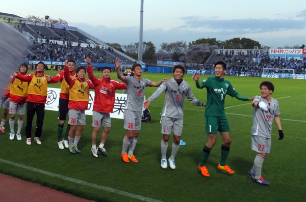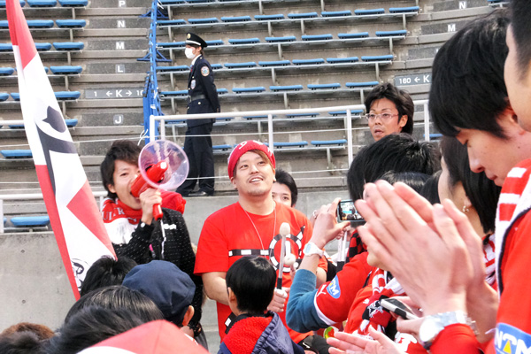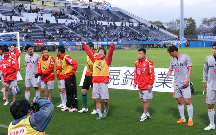 ハードワークで90分間走り回ったとは思えない軽い足取りでこちらへ向かってくる赤馬衆の表情。勝利のあと一番の楽しみは彼らの喜びを間近に見られること。