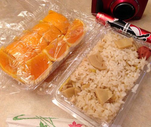 でもって、関東遠征で親しくさせていただいている件のサポさんから、意外ないただきものをしました。手作りのタケノコご飯と丁寧にカットされたフルーツ! 最高のスタグルメです。ありがとうございました。ホントに美味しかったです〜ご馳走様でした。