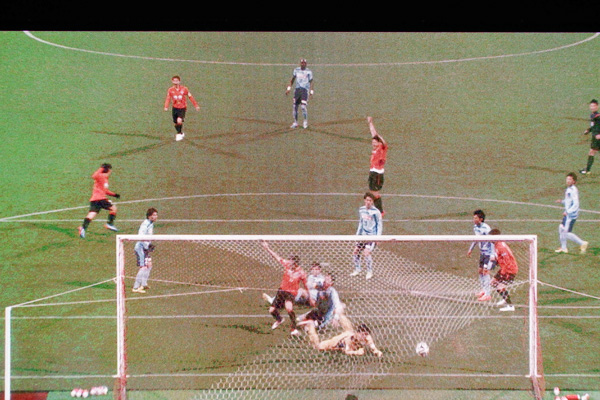 蹴りに行くのがハラダくんということだけは見て取れたけど、蹴った瞬間赤い選手がわっと左側に寄り始めたのに、ボールはそのはるか頭上を越えて右側へ。