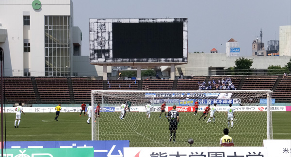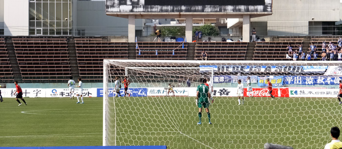 場所は水前寺スタゴール裏最前列。ここで試合中に倒れたりしたら周囲に大迷惑。その前に座って応援できる場所へ移動するかと本気で考え始めたところへ
