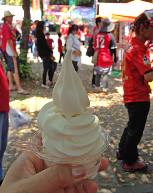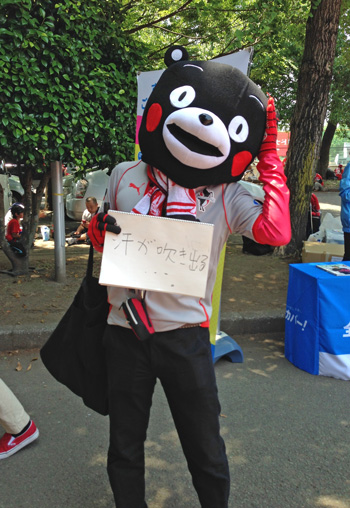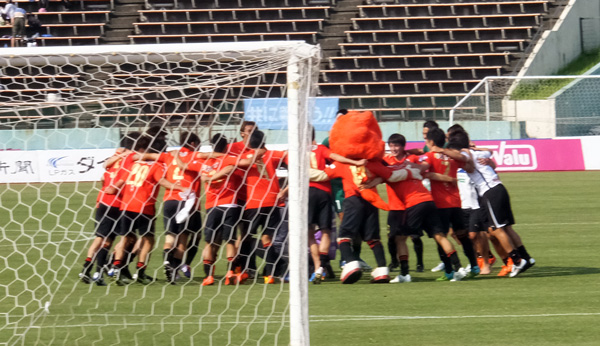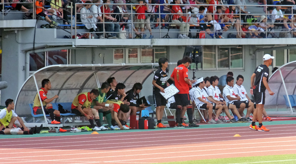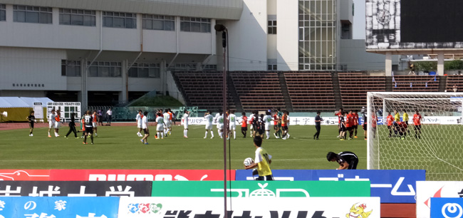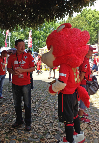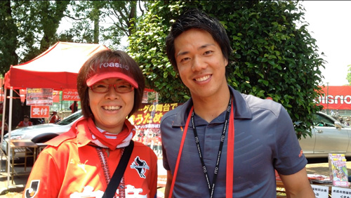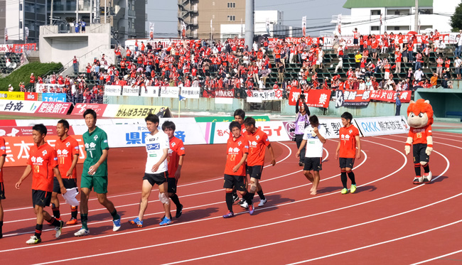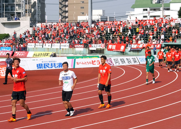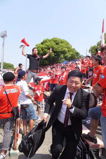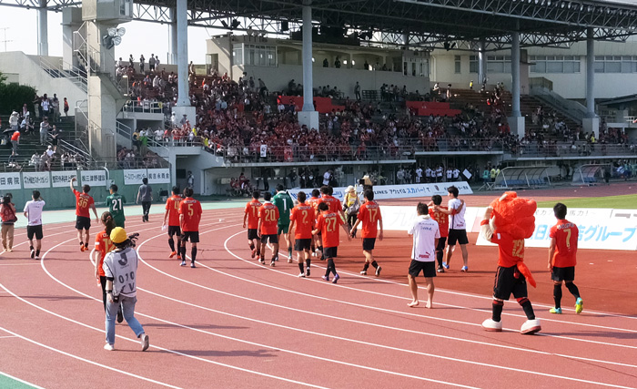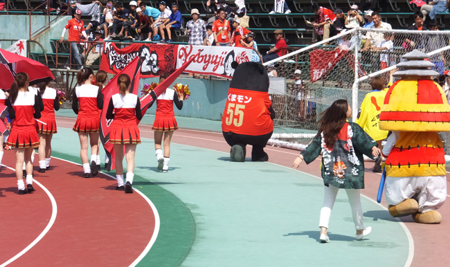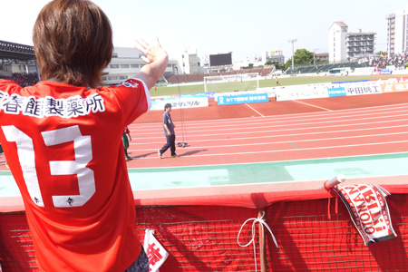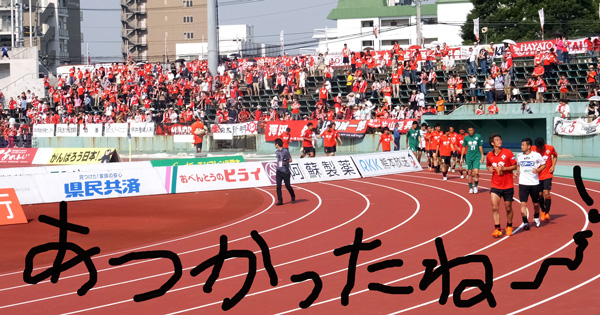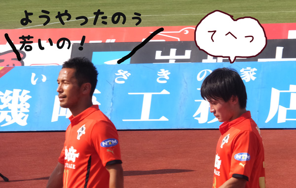 本気で久しぶりのカモンロッソは、そりゃーあの炎天下90分走りきった選手に3回飛び跳ねろってのは酷でした。何とかやり切ったと思ったか直後の万歳三唱がグダグダすぎて、何とチカラさんの駄目出し3回というイレギュラーっぷり(^^)