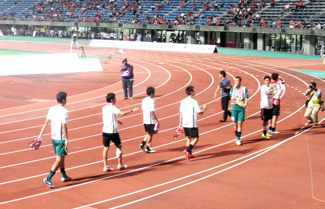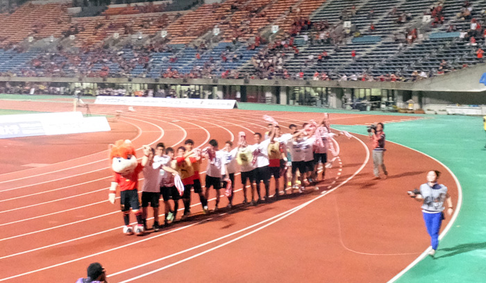 お疲れでしょうに勝利のグルグル! これは選手だけの特権パフォーマンス。ただ、いつもロアッソくんがいるのはなぜなんだろ(笑)