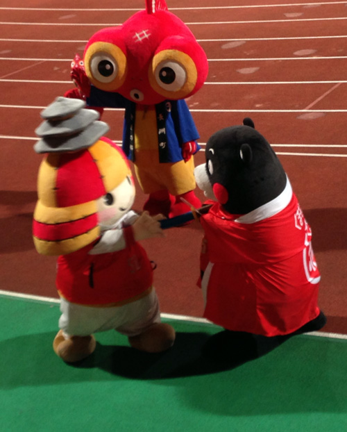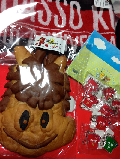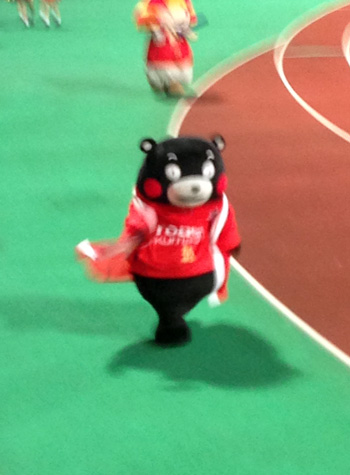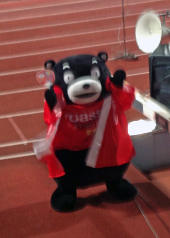 なんでユニの上に赤のガウン羽織ってるんだかわからんけど、くまモン営業部長がめっちゃ張り切ってお土産進呈やらキックインやら。