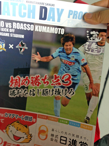 前半のうまスタホーム戦でいただいた団扇を持参したので、お約束通りのプレゼントいただきました。しかしなぜか熊本サポと見ると無条件で「どうぞどうぞ」とニコニコしながら手渡してくださる讃岐の担当スタッフさん。もうね、なんだかここホームみたいだよ〜。