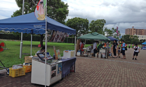 丸亀スタはバクスタ外側のスペースがイベント広場になっています。熊本城マラソンの広報のみなさんに遭遇したけどマスコットや他の方は岡山で足止めだった模様。ホント大変な遠征でしたよね。