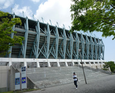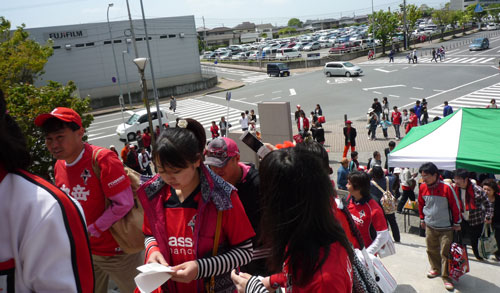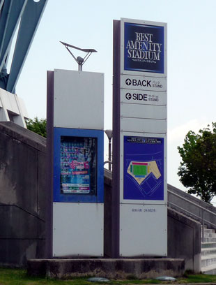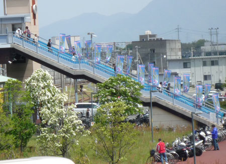 角の広場から見ると、駅から続く歩道橋はスタジアムへの階段部分はブルーでたくさんはためいているサガントスの幟がきれいでした。
