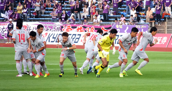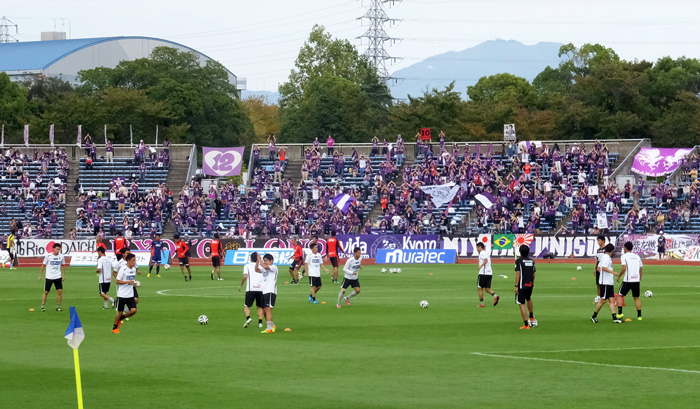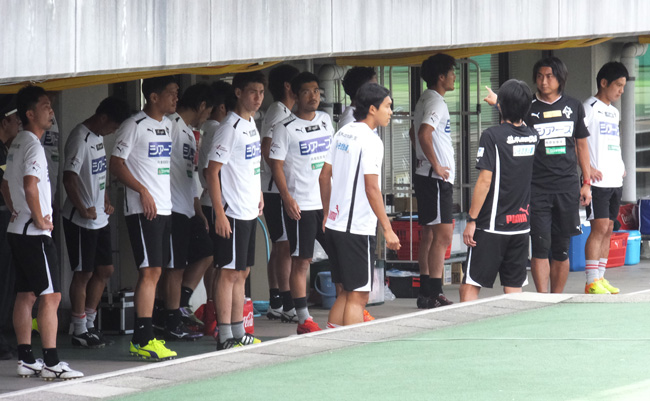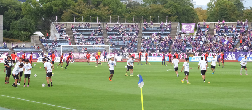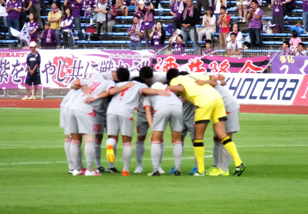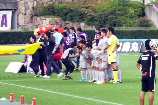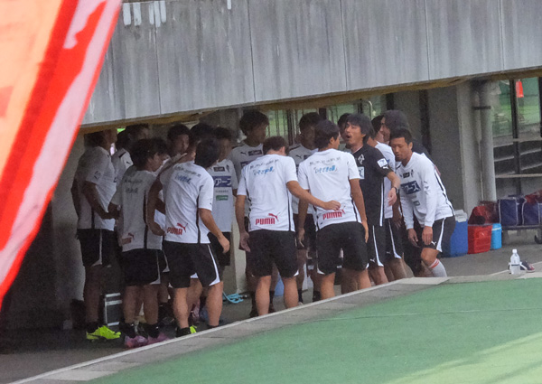 アウェーでは試合前練習に出るときの円陣が見られることが多い。今日も気合い充分。