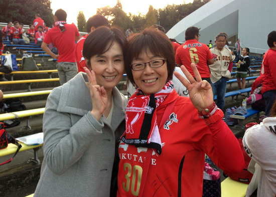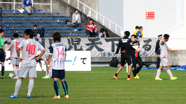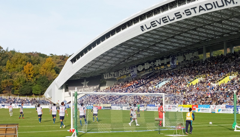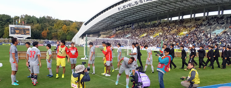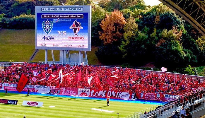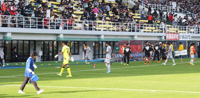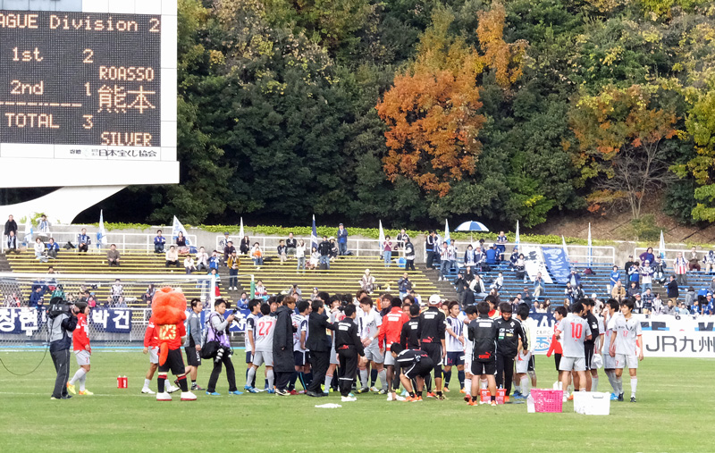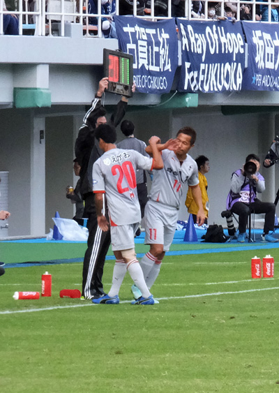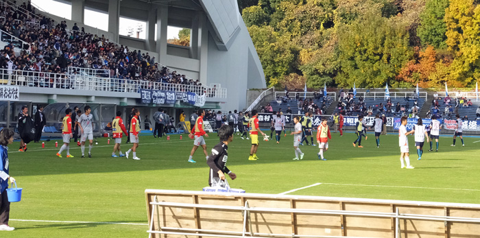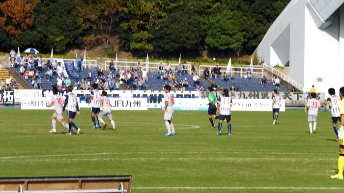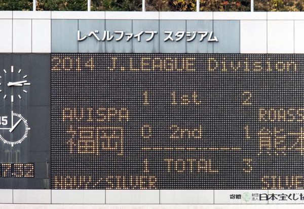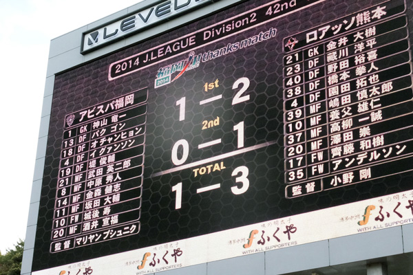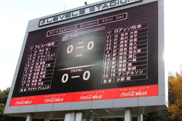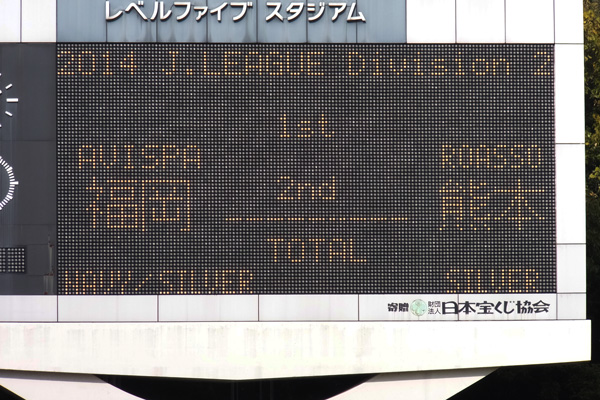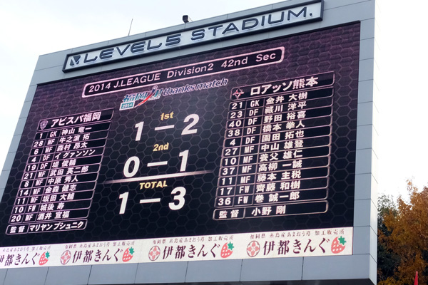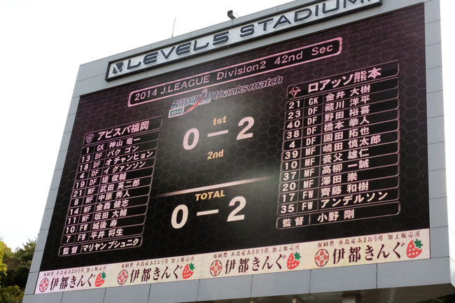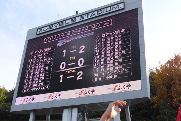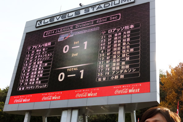 向こう側で誰がゴールしたのかわからず「熊本オーレ!」歌ってたらメイン側からさざ波のように「クラさんだよ!」「ヨーヘーだって」と聞こえてきて、得点者を知る。その後振り向いたら電光掲示板にデカデカと「得点者・藏川洋平」って出てたのでした。