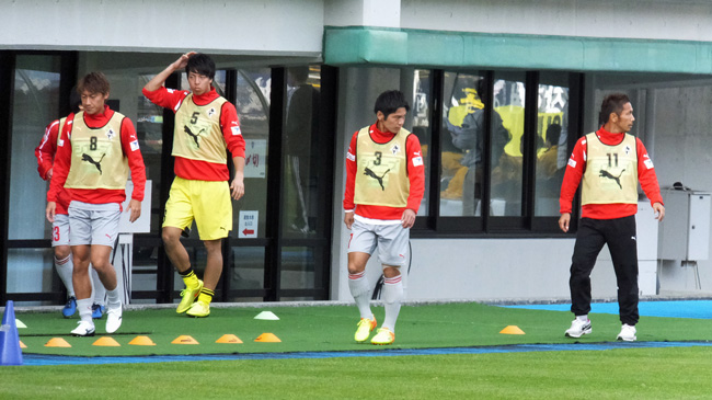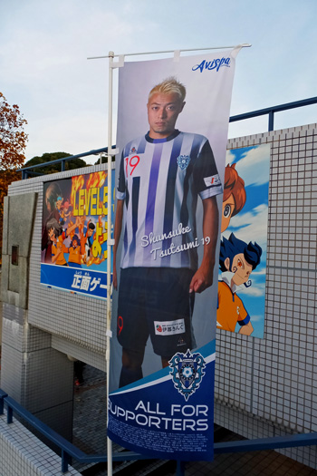 ツアーバスの駐車場に歩く途中で、ツツミン。心ならずも今日の試合はロアッソ側の選手になっちゃってた。
