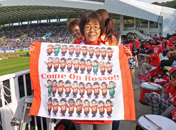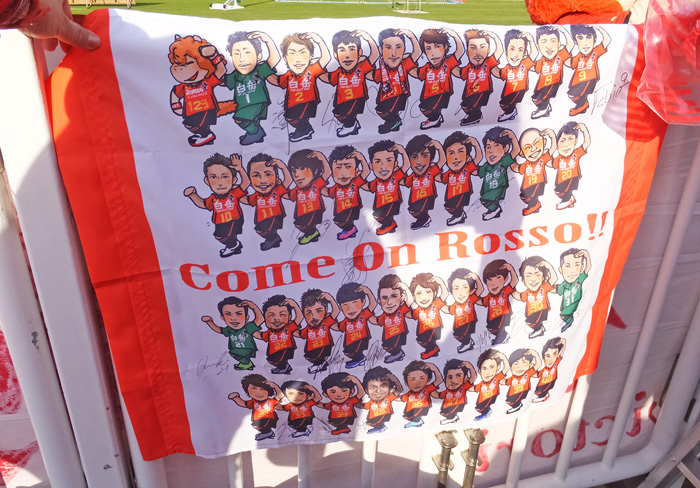 何しろ、今シーズン全員の似顔絵ゲーフラに全員のサインをもらうという大企画! 一番の難関は何と言っても仙台に帰っちゃった31番ダンくん。これを引き受けてくださったのがN村さんで、前日の仙台戦から今日福岡という八面六臂をこなして下さいました。