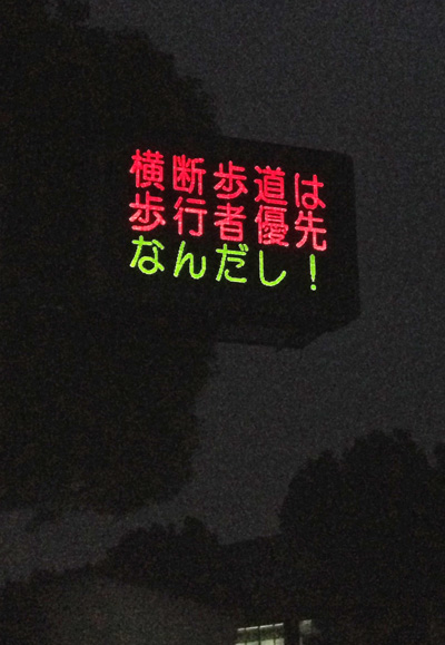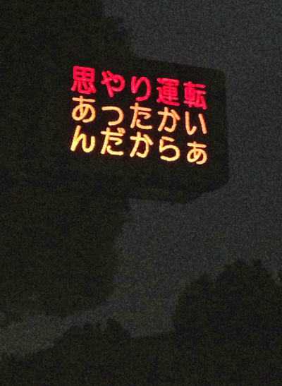 自宅から高速バス停への道すがらには、いつの間にか全国で有名になったらしい県警の電光掲示板が早朝から笑いを振りまいてます。
