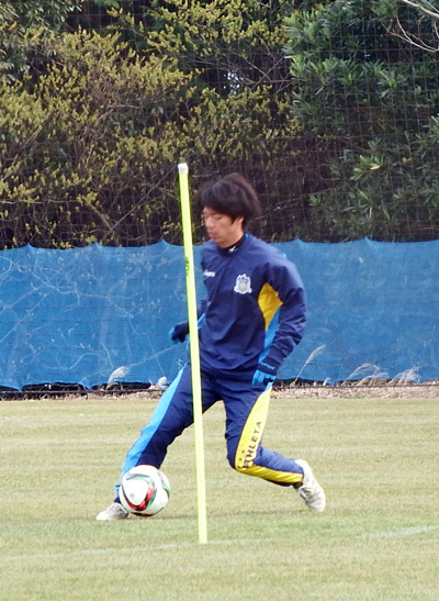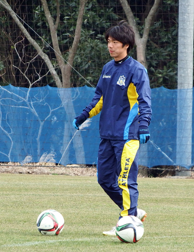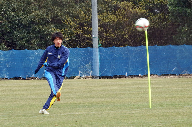 今日の相手チームである鹿児島ユナイテッドの選手が出てきました。五領くん元気いっぱい真剣な表情でセットアップ中。