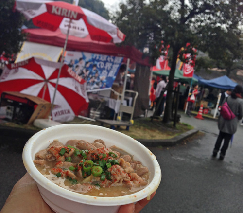 今シーズンもロアッソ熊本といえばスタグルメです。小雨で冷えていたので、かんしょやさんのホルモンから始まりました。