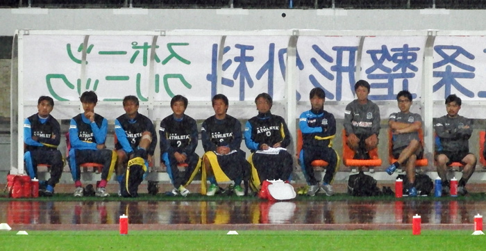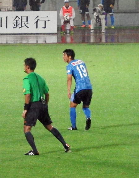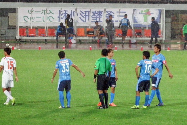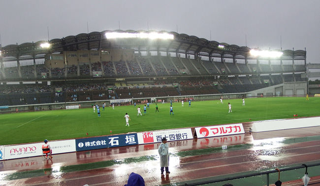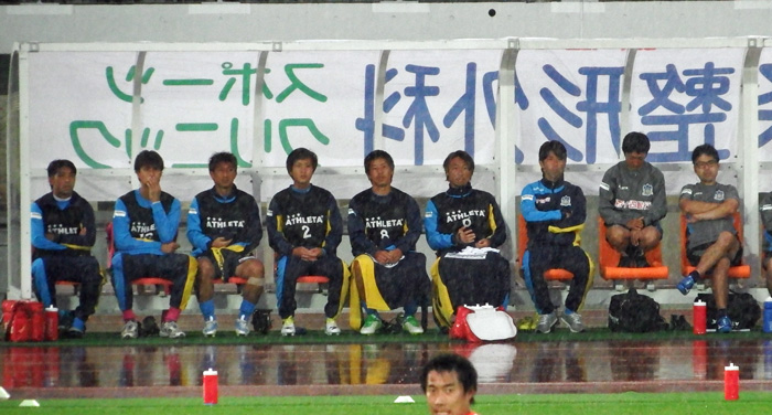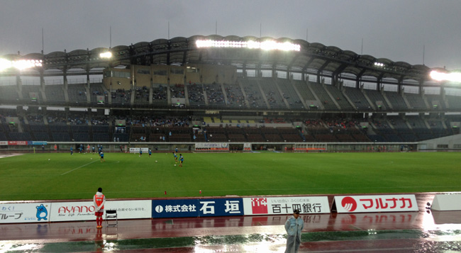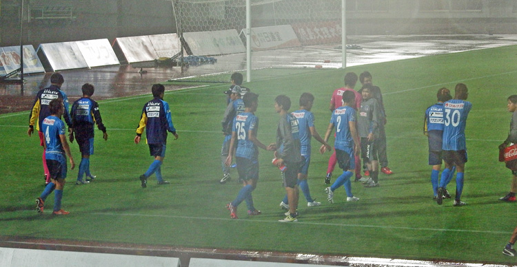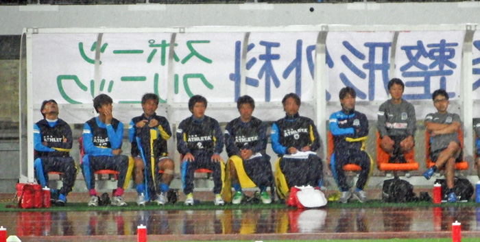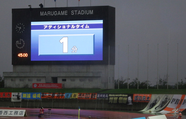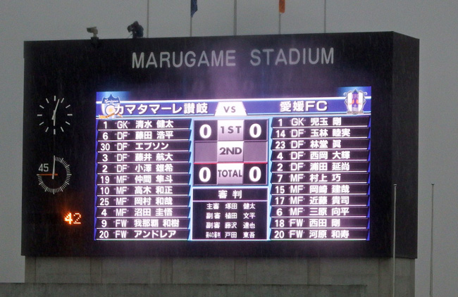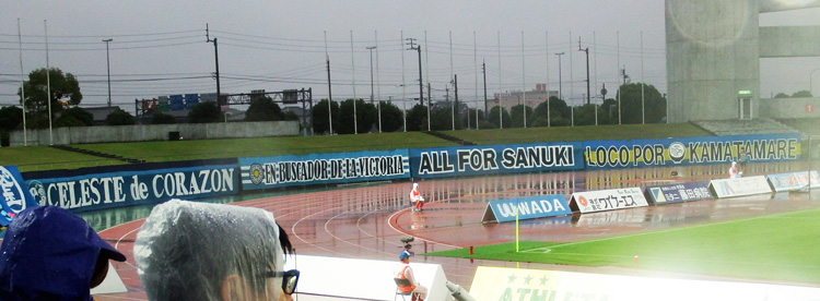 結果的に讃岐にも愛媛にもゴールは生まれなかったけれど、降りしきる雨と水を含んでボールが動くたび選手が走るたび飛沫が跳ね上がるピッチにあっても、讃岐の連係プレーはスピーディで鋭角的で全然見飽きることがなかった。