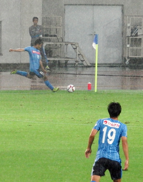 対角線上のCKは蹴るまで選手が雨に霞んで見えません