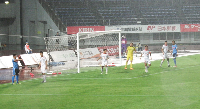 キジさんが交代出場したときの歓声と拍手はすごかった。なんせ前節熊本で決勝ゴール決めたエースだものね。この瞬間はスタジアム全体が大雨も吹き飛ばすくらい熱かった。